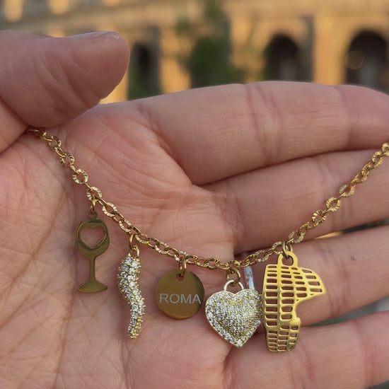 Catena in acciaio inossidabile da €13 con 5 Charm da €5 : calice di vino, peperoncino con strass, Colosseo, Charm Roma, cuore con strass